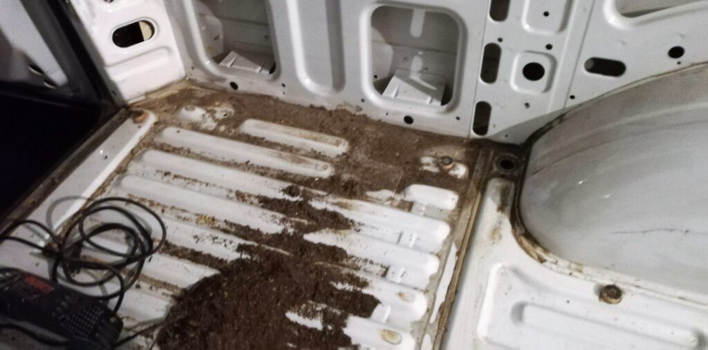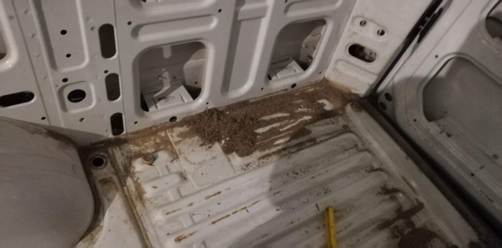 Um das Chassis für die nächsten Schritte vorzubereiten, musste erst mal ein wenig geputzt werden – ursprünglich gehörte das Fahrzeug einmal einer Gärtnerei…..was man an der vielen Erde unter der Bodenplatte sehen konnte. Zum Glück kam nie so viel Wasser zur Erde dazu, das das Blech anfing zu rosten 🙂